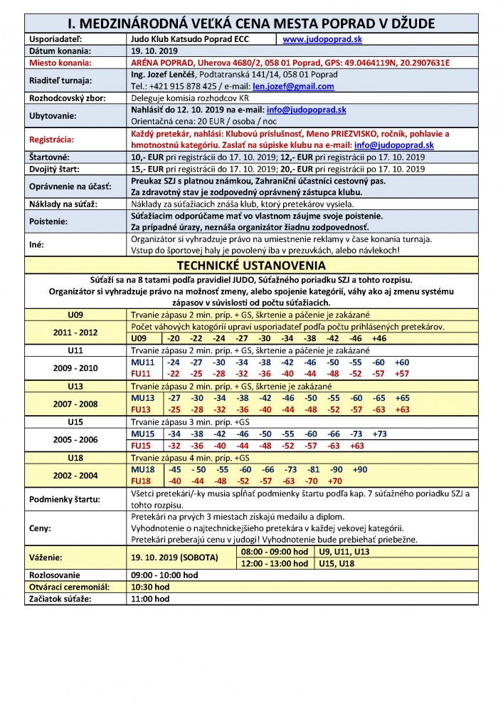 Aktuality I. MEDZINÁRODNÁ VEĽKÁ CENA MESTA POPRAD V DŽUDE 27.08.2019 - 23:36 Organizujeme I. ročník Veľkej Ceny Mesta Poprad v Džude. Súťaž sa bude konať 19. októbra 2019 v športovej hale Aréna Poprad. Bližšie informácie nájdete v rozpise uvedenom nižšie. << Späť na predošlú stránku